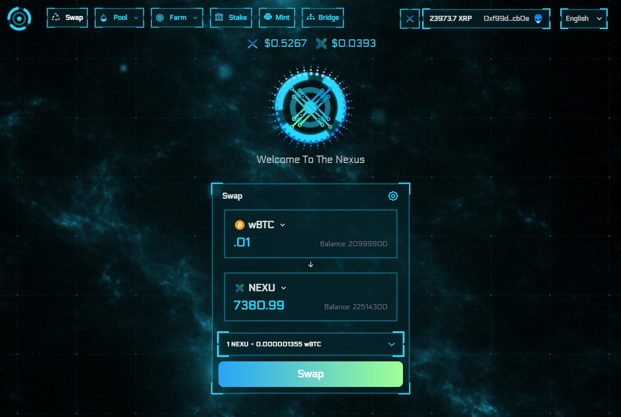 The Nexus Decentralized Exchange is the singularity point where users can exchange assets from across the blockchainverse. Users can create markets for their own tokens or pre-existing ones by creating liquidity pools to make their assets tradeable. Liquidity providers can put their liquidity tokens into the NexusGenerator to earn more $NEXU and potential Superfarm rewards, which can help mitigate the impermanent loss that comes from being a provider in a decentralized system. Nexus's unique Superfarm mechanism allows community members to make their own incentivized liquidity pools with customized tokens. Nexus's unique Multi-Staking system allows users to stake their $NEXU and/or $ETHER to earn swap fees in the form of Liquidity Tokens. Users can earn a plethora of different NLP tokens that can be compounded back into the Nexus Generator to earn more $NEXU. Multi-Staking can also receive a variety of other ERC-20 tokens from many sources and distribute it back to stakers. 10% of $NEXU minted by the NexusGenerator is also distributed to the Nexus Core Multi-Staking. A portion of the swap fees ($WXRP/$NEXU pair) are used to buy and burn $NEXU which makes the supply long term deflationary.